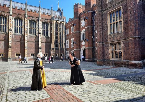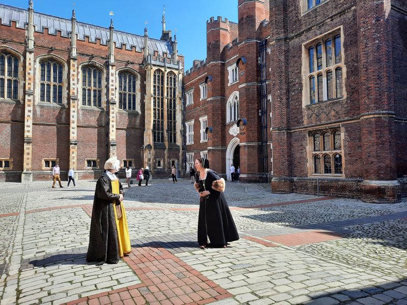 Wir haben Glück – unser Flug geht ganz spät, so dass wir noch Zeit für den Besuch eines besonderen Schlosses haben. Hampton Court liegt abseits von London und ist nicht immer im Programm. Die Architektur der Tudorzeit ist beeindruckend und wird durch die entsprechend bekleideter Schauspieler, die sich durch die Räume bewegen und kleine Szenen spielen, lebendig gemacht.