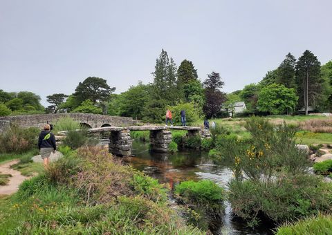 Die Strecke heute ist in der Länge vergleichbar mit der gestrigen, aber sie hat was in sich. Wir verlassen die zweispurigen Straßen und fahren auf den engen Wegen, wo es manchmal eine halbe Stunde dauert, bis der Bus an einem PKW vorbeifahren kann. Deswegen starten wir heute besonders zeitig. Schon um acht Uhr sind wir unterwegs zu dem berühmt berüchtigten Dartmoor, den Schauplatz von vielen schaurigen (Literatur)Geschichten, die im Nebel passieren. Man denke nur an „Der Hund von Baskerville“ von Arthur Conan Doyle oder „Das Geheimnis von Sittaford“ von Agatha Christie. Hier befinden sich Hochmoore, gewaltige Hügel und tiefe Täler. Die Felsen heißen Tors, über sie werden unzählige Legenden erzählt, mit Hexen, Riesen und Menschen. Aber es ist auch ein geschichtsträchtiger Ort. Schon vor unserer Zeit wurde hier Zinn abgebaut und bis nach Griechenland verschifft. Aus dem 11. Jh. sind noch die Clapper Bridges (Steinplattenbrücken) erhalten, die mit den Pferdewagen (kaum zu glauben!) befahren wurden.