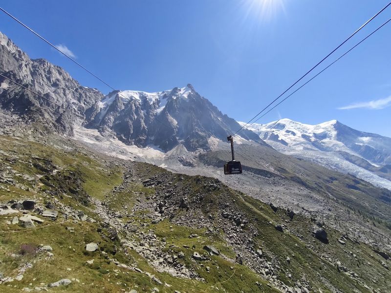 Weiter geht’s mit unserem Bus nach Chamonix, dem vielbesuchten Wintersportort in den französischen Alpen. Unsere Blicke richten sich während der Fahrt immer wieder nach vorn: wie wird sich das Wetter in Chamonix zeigen? Und das Wetter spielt mit: blauer Himmel und strahlender Sonnenschein. Wir wollen heute hoch hinauf auf 3.842 m.ü.M. Der Aiguille du Midi, ein Vorgipfel zum Mont Blanc, wartet auf uns und wir haben weiterhin Glück: wir bekommen auch ohne Voranmeldung ein Zeitfenster für die Auffahrt mit der Seilbahn.