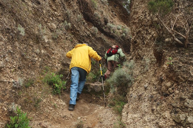 Trekkingstöcke gehören mittlerweile fast zur Standardausrüstung, vor allem zur Entlastung der Kniegelenke beim Abstieg. Wer rüstig ist, sollte die Stöcke aber nicht ständig, sondern nur zur Überwindung anspruchsvoller Passagen nutzen. Erstens hat man dann die Hände frei und zweitens verwöhnt man die Körperbeherrschung und den Gleichgewichtssinn nicht zu sehr. Daher werden heute vorwiegend Teleskopstöcke benutzt, welche zusammengeschoben nur etwa ein halben Meter lang sind und so gut in den Rucksack passen. Wichtig ist das auch beim Flug: viele Länder akzeptieren Wanderstöcke nicht als Handgepäck - deshalb bitte immer im Koffer transportieren!