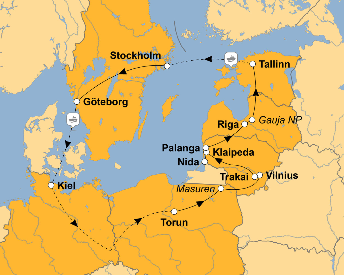 Den baltischen Startschuss setzt Litauens Hauptstadt. Das katholisch geprägte Vilnius repräsentiert sich über seine monumentalen Kirchen. Eine besondere Würze erhält diese Stadt durch die Wasserfestung Trakai inmitten einer idyllischen Seenlandschaft. Eine ganz andere Optik erwartet Sie an der Kurischen Nehrung mit kleinen Fischersiedlungen und riesiger Dünenlandschaft, während die Fachwerkhäuser der Hafenstadt Klaipeda für Atmosphäre sorgen. Litauen lässt Sie von regionalen Leckereien naschen, zeigt Ihnen Bernsteine und lädt zur Klettertour auf die Hohe Düne.