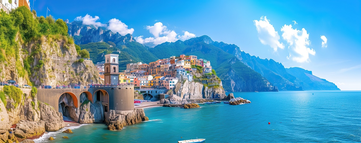 Amalfi, eine Perle an der italienischen Amalfiküste, verzaubert mit steilen Klippen, bunten Häusern und mediterranem Flair. Die einst mächtige Seerepublik beeindruckt heute mit ihrem Dom, engen Gassen und malerischem Hafen. Zitronenhaine, das türkisfarbene Meer und kulinarische Genüsse wie Limoncello machen Amalfi zu einem unvergesslichen Reiseziel. Die Küstenstraße bietet atemberaubende Ausblicke und verbindet Amalfi mit weiteren Highlights wie Positano und