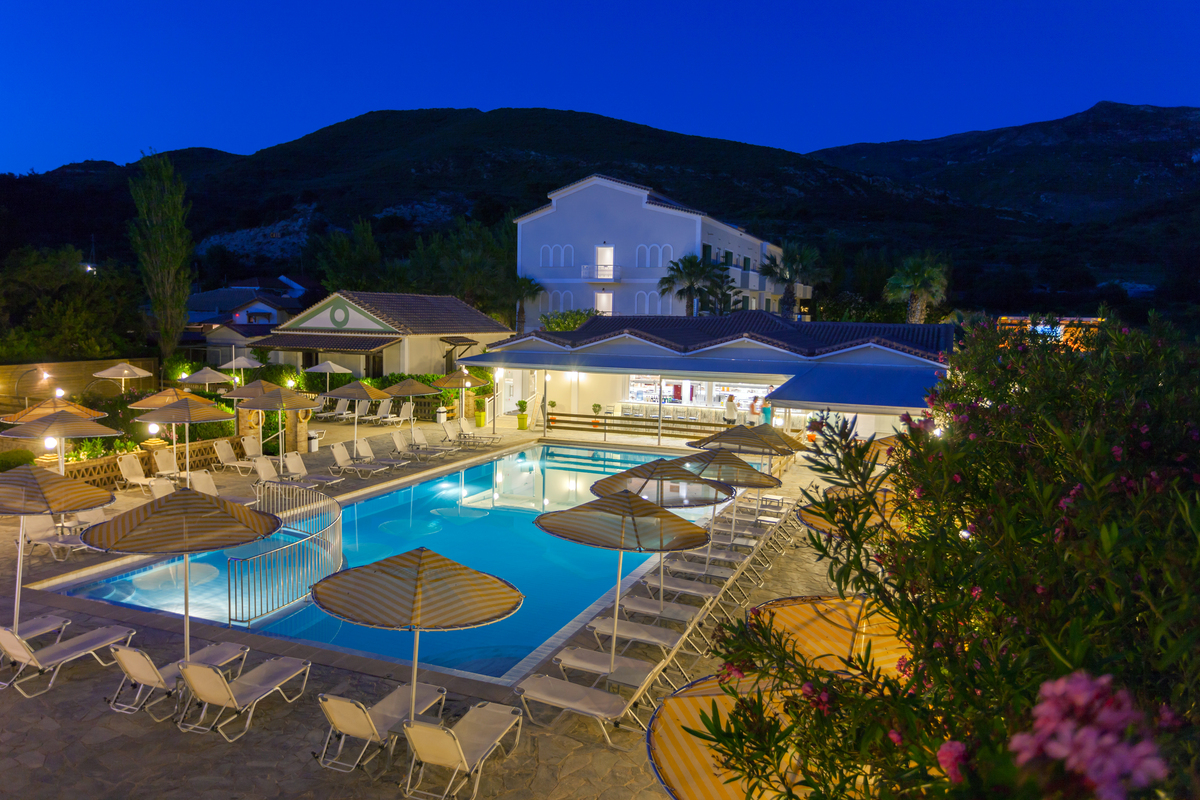 Ausstattung & Lage: Das Hotel liegt in idealer Lage nahe des Sandstrands von Kalamaki. Perfekt für Badeurlauber und Sonnenanbeter. Geschäfte, Restaurants und Bars sind bequem zu Fuß erreichbar und die Inselhauptstadt Zakynthos-Stadt sowie das bekannte Laganas liegen nur wenige Kilometer entfernt. Eine Bushaltestelle befindet sich in der Nähe. Das Haus bietet eine einladende Lobby mit Rezeption, ein Restaurant mit mediterraner Küche sowie eine Bar für den Drink am Abend. Im Außenbereich erwartet Sie ein Pool mit Liegen und Sonnenschirmen – ideal für entspannte Stunden unter der griechischen Sonne.