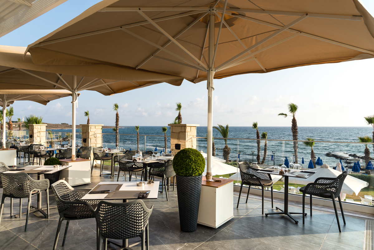 Lage & Ausstattung: Die weitläufige Anlage liegt unmittelbar am Meer, zwischen dem historischen Leuchtturm und den berühmten Königsgräbern. Das Zentrum von Paphos mit seinen Tavernen, Geschäften und archäologischen Sehenswürdigkeiten erreichen Sie bequem zu Fuß über die Uferpromenade. Die Anlage ist wie ein kleines Dorf gestaltet, mit gepflegten Gärten, niedrigen Gebäuden und viel Raum für Begegnung. Der große Außenpool mit Blick auf das Meer lädt zum Schwimmen und Sonnenbaden ein, während der beheizte Innenpool, die Sauna und das Dampfbad im kleinen Spa-Bereich für zusätzliche Erholung sorgen. Sportlich Aktive freuen sich über ein Fitnessstudio, Tennisplätze und verschiedene Freizeitangebote wie Beachvolleyball oder Tischtennis. Abends sorgen Themenabende und gelegentliche Live-Musik für Unterhaltung. Kulinarisch verwöhnt das Resort mit einem internationalen Buffetrestaurant, das zypriotische Spezialitäten ebenso bietet wie mediterrane Klassiker. Das À-la-carte-Restaurant „Divine Breeze“ (gegen
