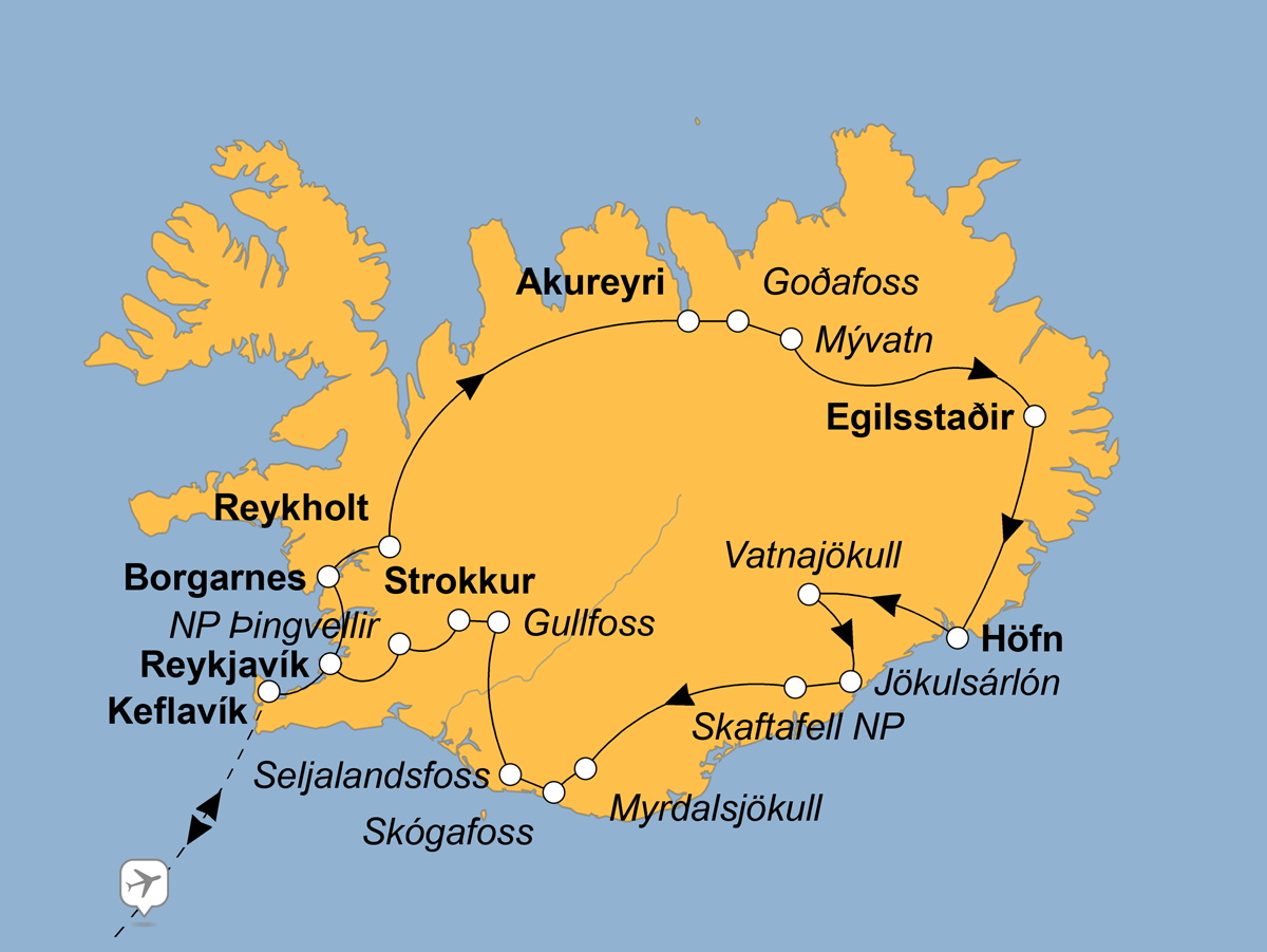 - Aufenthalte: Heißwasserquelle Deildartunguhver, an den Wasserfällen Hraunfossar, Barnafoss, Godafoss, Skógafoss, Seljalandsfoss & Gullfoss, Mývatn-Gebiet mit Lavalabyrinth in Dimmuborgir & Pseudokrater Skútustadir, Ostfjorde, Gletscherlagune Jökulsárlón, Nationalpark Skaftafell, Lavafeld Eldhraun, Strand von Vik, Felsentor Kap Dyrhólaey, Thermalgebiet Haukadalur mit Geysir & Strokkur, Nationalpark Thingvellir