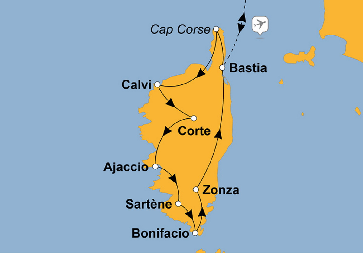 Sie werden aber nicht nur alle „Vegetationsetagen“ der Insel kennenlernen, sondern auch die Kultur und Lebensweise ihrer Bewohner. Sie besuchen idyllische Berg- und Fischerdörfer sowie quirlige Städte, darunter Bastia, Ajeccio und Porto Vecchio. An der Steilküste von Bonifacio unternehmen Sie eine Bootsfahrt (fakultativ und wetterabhängig).