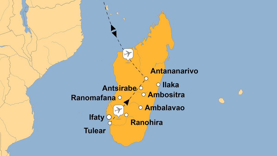 Aber auch touristisch ist Madagaskar von einzigartiger Vielfalt. Tropische Regenwälder wechseln sich mit Dornsavannen und fruchtbarem Hochland ab. Reisterrassen, Vanilleplantagen und Thermalquellen prägen die Landwirtschaft. Die französische Kolonialzeit hat idyllische Städte hinterlassen und paradiesische Strände und Tauchreviere locken Sonnenurlauber rund ums Jahr auf die Insel. Auf unserer Rundreise „nehmen wir alles mit“, was die Insel ausmacht – Fahrten mit dem Bus, Wanderungen in die Natur, Strandtage und Stadtbesichtigungen. Und wer weiß – vielleicht denken Sie nach zwei Wochen im Paradies ja tatsächlich übers Aussteigen nach?