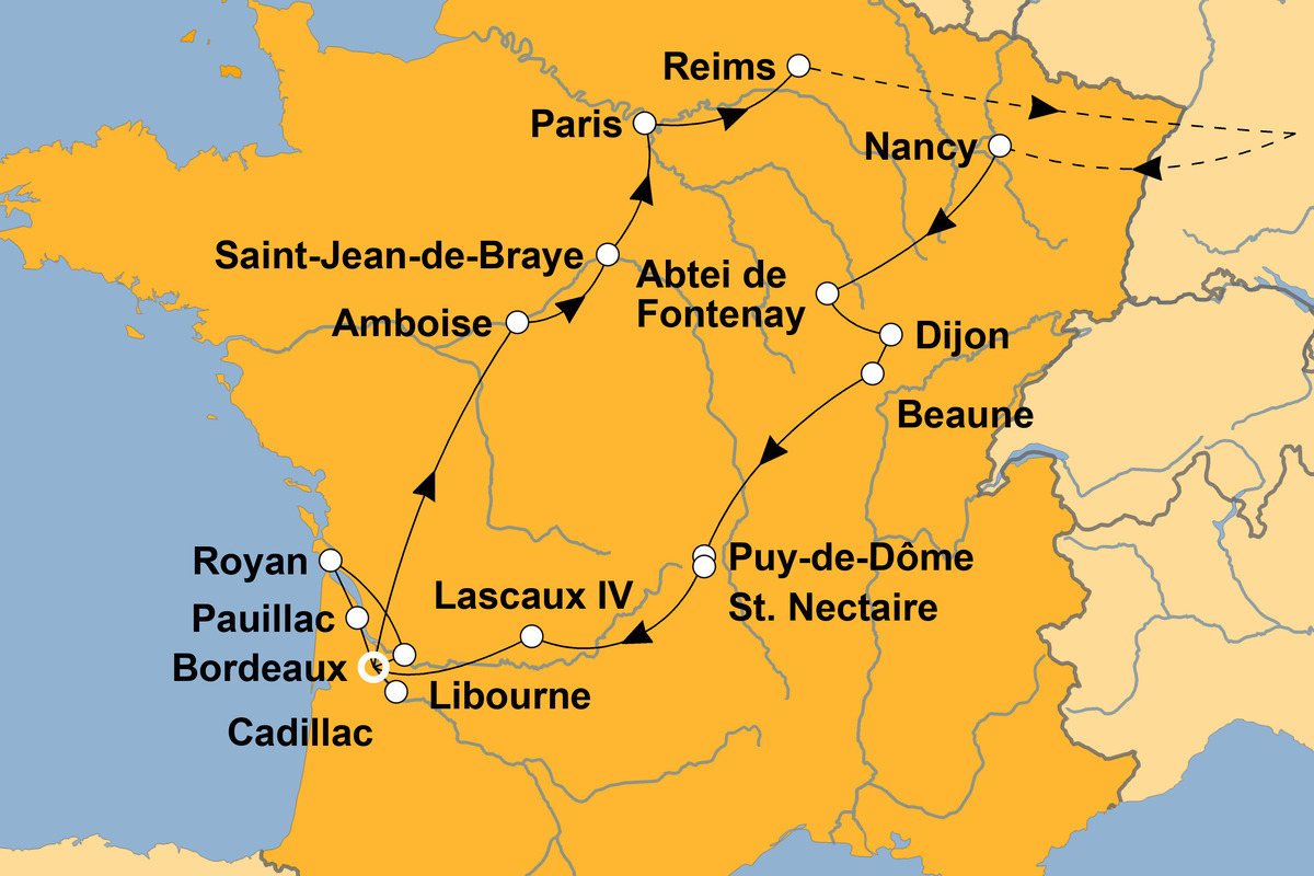 10. Tag: | Bordeaux | Ausschiffung nach dem Frühstück; Besuch des Königsschlosses Amboise, einem der schönsten Schlösser der Loire mit dem HistoPad; Abendessen und Übernachtung im Hotel in Saint-Jean-de-Braye | ||