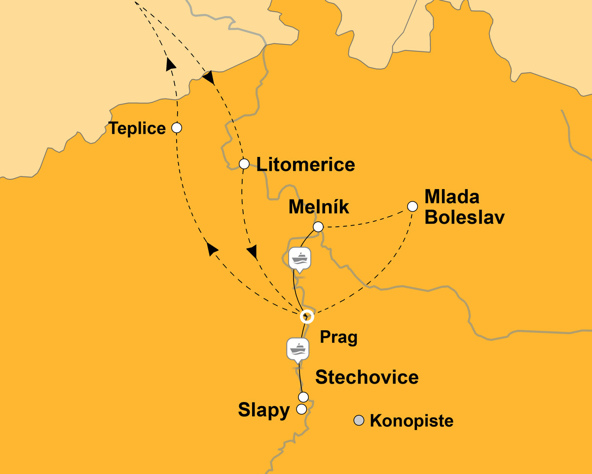 Nach der Einschiffung in der tschechischen Hauptstadt nehmen Sie Kurs auf Štěchovice und die Talsperre Slapy. Bei einem Ausflug lernen Sie das Schloss Konopiště, das erste mit elektrischem Fahrstuhl, Strom- und Wasseranschluss ausgestattete Schloss kennen. Hier ist der Umkehrpunkt Ihrer Kreuzfahrt erreicht, von hier geht es wieder zurück in Richtung Prag, wo das Kreuzfahrtschiff für zwei Nächte anlegt. Lernen Sie bei einem Rundgang die Tschechische Hauptstadt kennen, bevor Sie mit dem Schiff der Moldau bis zur Mündung in die Elbe nach Melnik folgen. Hier besuchen Sie mit Antonin Dvořák einen weiteren tschechischen Komponisten von Weltrang im Dvořák-Haus. Schloss Nelahozeves hoch über der Moldau ist mit seiner Renaissance-Sgraffito-Fassade selbst ein Kunstwerk. Wunderschön!