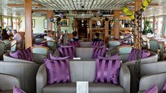 Auf den weitläufigen Decks, die mit einem Lift verbunden sind, befinden sich die Rezeption, die Piano-Bar mit Terrasse, der elegant ausgestattete Salon mit Bar und das Restaurant, in dem die Mahlzeiten (Frühstück und am Tisch serviertes Mittag- und Abendessen) eingenommen werden.