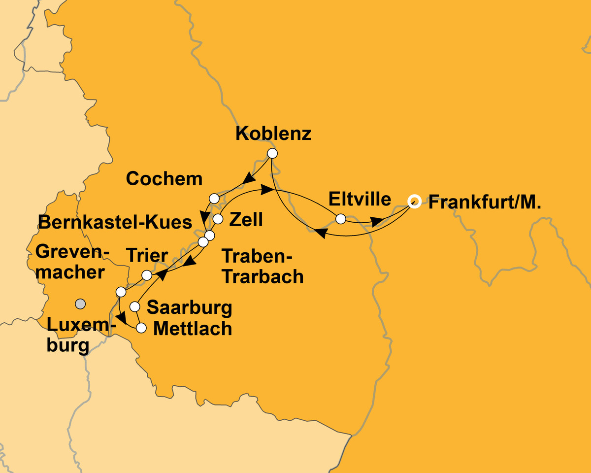 Frankfurt – Koblenz – Cochem – Traben-Trabach – Trier – Grevenmacher – Mettlach – Saarburg – Bernkastel – Zell – Eltville – Frankfurt