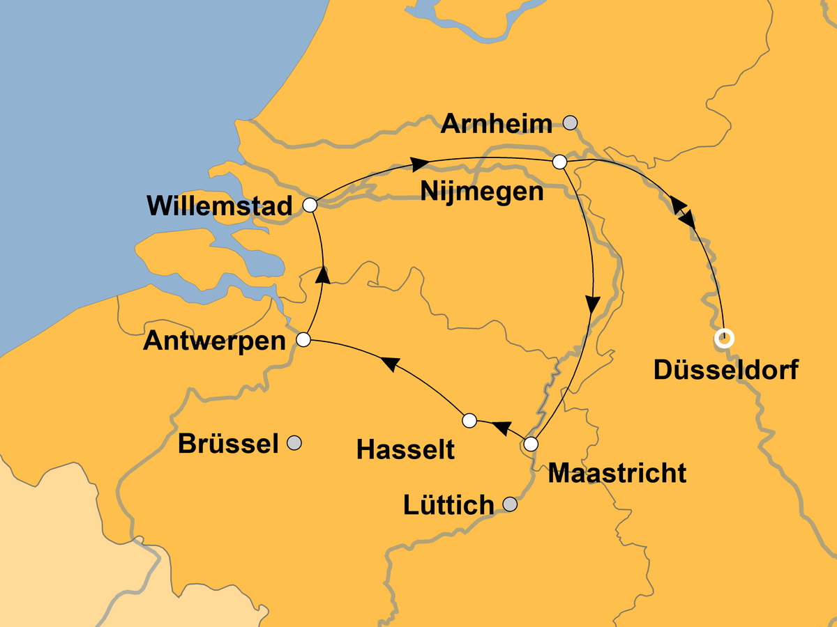 Die Römer waren es auch, die weitere Stationen Ihrer Flussreise gründeten und die Sie bei Ihren Landgängen besuchen wollen: Nijmegen als älteste Stadt Hollands liegt ebenso auf Ihrer Route auf Rhein und Maas, wie Dordrecht, sowie die belgischen Stadtschönheiten Lüttich und Antwerpen.