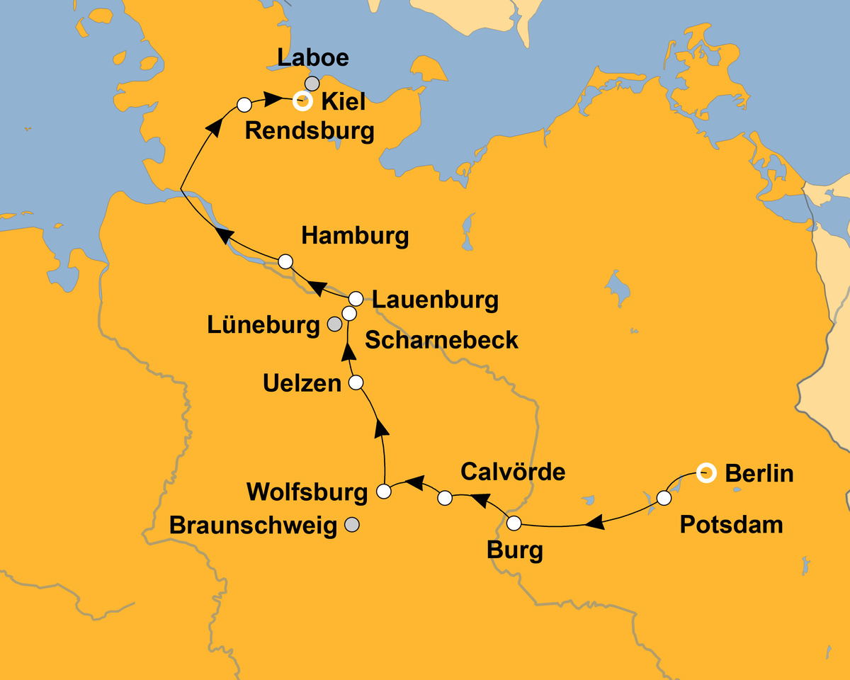 Zuvor besichtigen Sie die Hauptstadt Berlin, das königliche Potsdam, die Löwenstadt Braunschweig und natürlich die alte Salz- und Fachwerkstadt Lüneburg. Nach einer Stadtführung in Hamburg und Ihrer Passage durch den Nord-Ostsee-Kanal erreichen Sie schließlich die Ostseemetropole Kiel, welche Sie natürlich vor der Heimreise noch auf einer Stadtrundfahrt besichtigen.