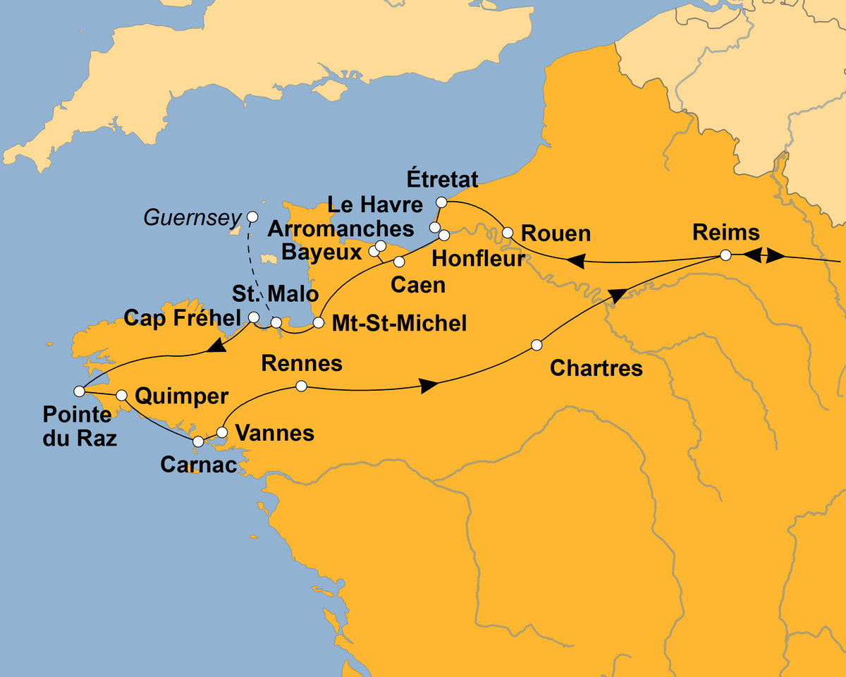 Lassen Sie am besten alle Vorurteile zu Hause und sich ganz auf das Abenteuer Nordfrankreich ein. Die Fachwerkstadt Rouen, die Hafenstadt Honfleur, Bayeux, Arromanches und Caen sind Ihre Stationen in der Normandie; St. Malo, der Klosterfelsen Mont St. Michel, Pointe du Raz (Frankreichs westlichster Punkt), das idyllische Quimper mit seinen Kanälen Ihre Etappenziele in der Bretagne.