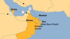 - Aufenthalte: Insel „The Pearl“, Promenade „Al Corniche“, MIA Park, Katara Village, Große Moschee und Souk in Doha; Imam Muhammad ibn Abd al-Wahhab Moschee; Fischmarkt und Souk in Muttrah; Küstenstadt Barka; Souk in Nizwa; Wadi Bani Khalid; Hafenstadt Sur