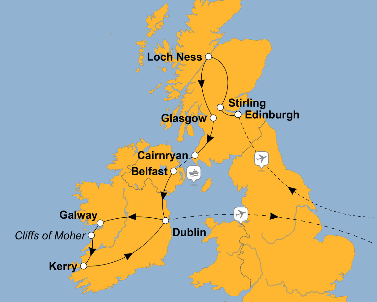Diese Rundreise erleben Sie gemeinsam mit unseren Gästen der gleichen Busreise von sz-Reisen. Sie fliegen eigenständig nach Edinburgh/Glasgow und von Dublin zurück. Ihre Reisegruppe und Ihre sz-Reiseleitung treffen Sie vor Ort. Wir bewahren dadurch dennoch den Charakter einer exklusiven Gruppenreise von sz-Reisen (keine Gäste von anderen Veranstaltern).
