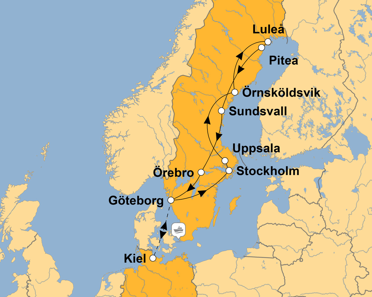 Im komfortablen Reisebus fahren Sie nach Kiel. Hier legt am Abend Ihr Fährschiff der Stena Line ab. Genießen Sie den Abend an Bord. Die Fähre bringt Sie über Nacht nach Schweden.