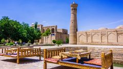 Das Wahrzeichen von Buchara ist die Kalan-Moschee und das 45 Meter hohe Minarett, das wie ein Leuchtturm den Karawanen Orientierung gab. Ihre Augen werden sich an der fast märchenhaften Farbigkeit der Kacheln und Kuppeln in blau und smaragdgrün kaum satt sehen können.