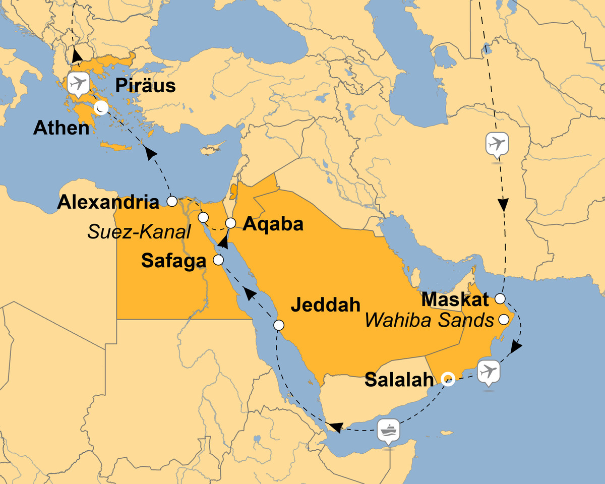 Durch den Suez-Kanal vom Orient in den Okzident für Sie diese einmalige Kreuzfahrtroute. Neben dem Oman, welchen Sie bereits während eines intensiven Vorprogramms kennen lernen, erleben Sie den bedeutendsten Hafen Saudi Arabiens in Jeddah ebenso, wie Aqaba in Jordanien und Safaga sowie Alexandria in Ägypten. So bekannte Ziele wie die eindrucksvolle Wüstenlandschaft des Wadi Rum, die rosarote Felsenstadt Petra, das Weltwunder Pyramiden von Giseh und die einmaligen Tempelanlagen im Tal der Könige sind nur eine Busfahrt entfernt. Krönender Abschluss dieser ganz besonderen Reiseroute ist die Stadtrundfahrt in Athen, mit der Ihre Kreuzfahrt endet.