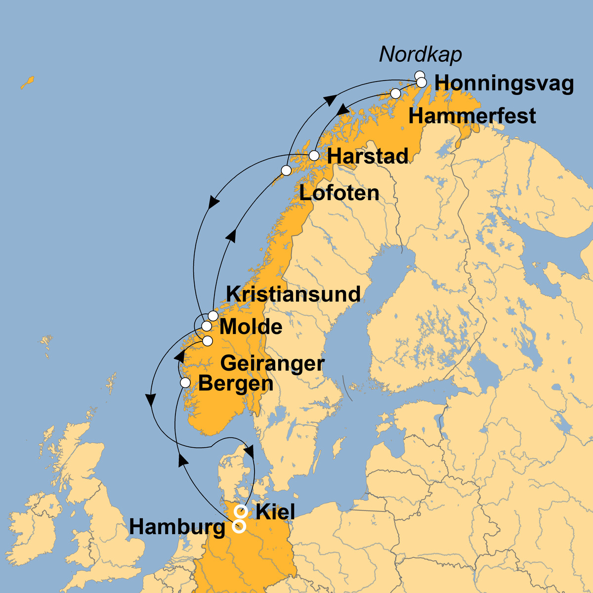 Hamburg – Bergen – Geiranger – Kristiansund – Svolvær/Lofoten – Honningsvåg/Nordkap – Hammerfest – Harstad – Molde – Kiel