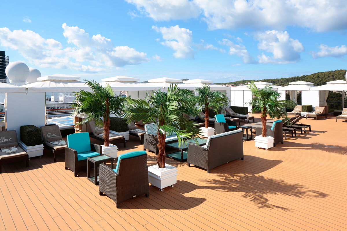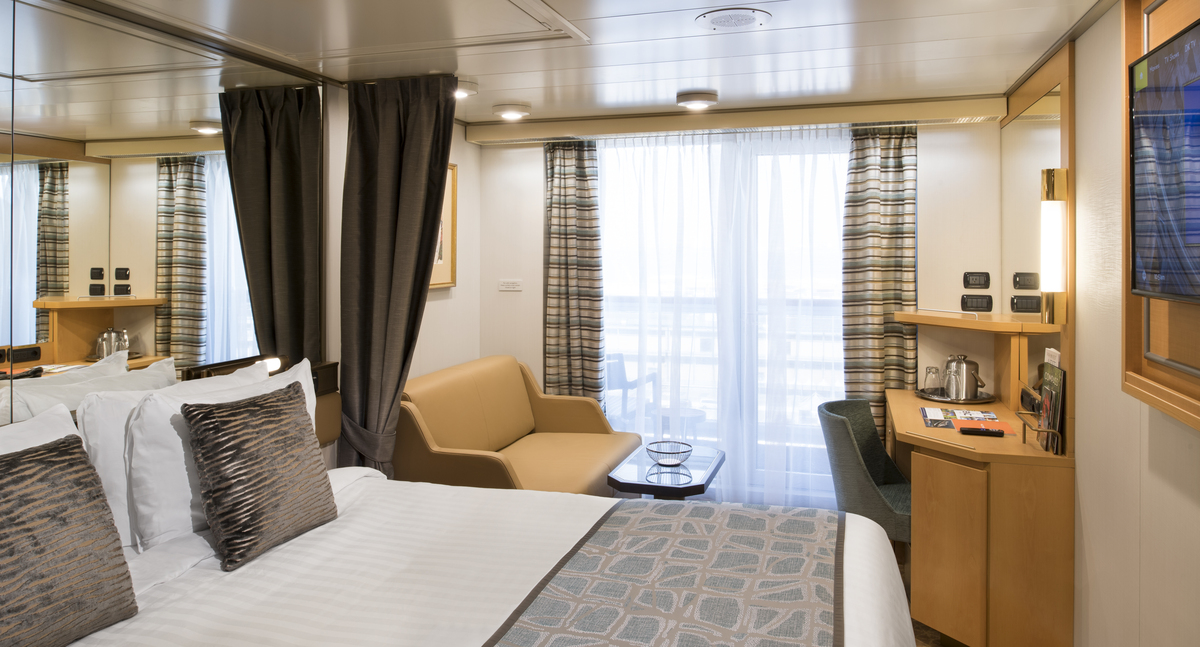 Die Kabinen sind mit zwei Einzelbetten, die sich in ein Queensize-Bett umwandeln lassen, ausgestattet. Tägliche Zimmerreinigung gehört genauso zum Angebot, wie Seife, Lotion, Shampoo, luxuriöse Bademäntel, großzügiger Stauraum, Safe, Haartrockner, Eis-Service, Schuhputz-Service, TV mit On-Demand-Filmen und Programmen. Alle Kabinen verfügen darüber hinaus über einen Mini-Kühlschrank.