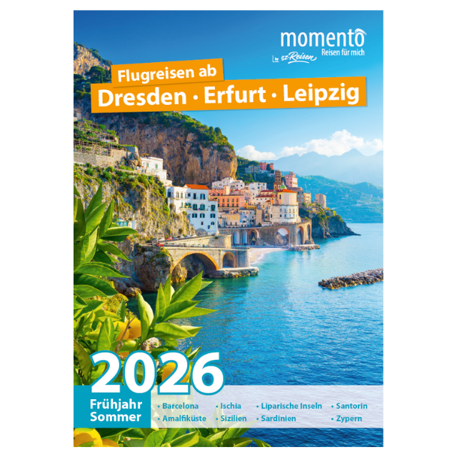 Mit momento starten Sie direkt ab Dresden, Erfurt und Leipzig zu den schönsten Zielen Europas - bequem und nonstop. Blättern Sie jetzt durch den neuen Katalog Frühjahr/Sommer 2026 – Ihre nächste Auszeit wartet schon!