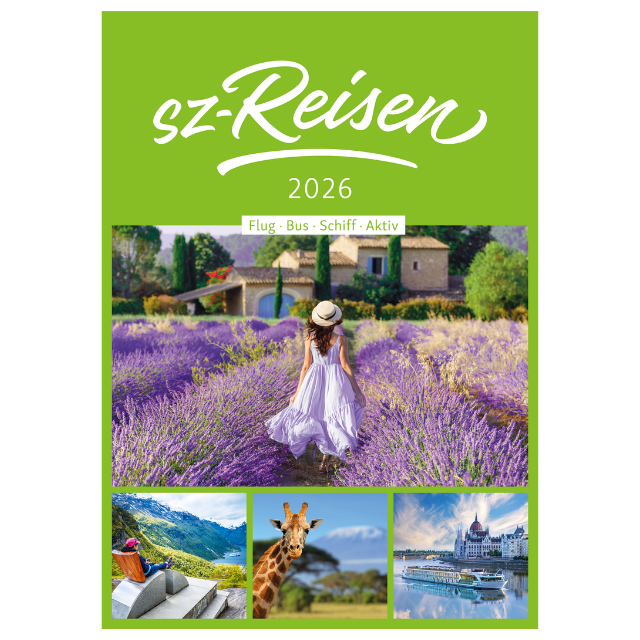 Unser brandneue sz-Reisen Hauptkatalog 2026 ist da! Freuen Sie sich auf unsere gesamte Reisevielfalt auf einen Blick und lassen Sie sich für Ihre nächste Traumreise inspirieren - ob Flug, Bus, Schiff oder Aktiv! Wir beraten Sie gerne.